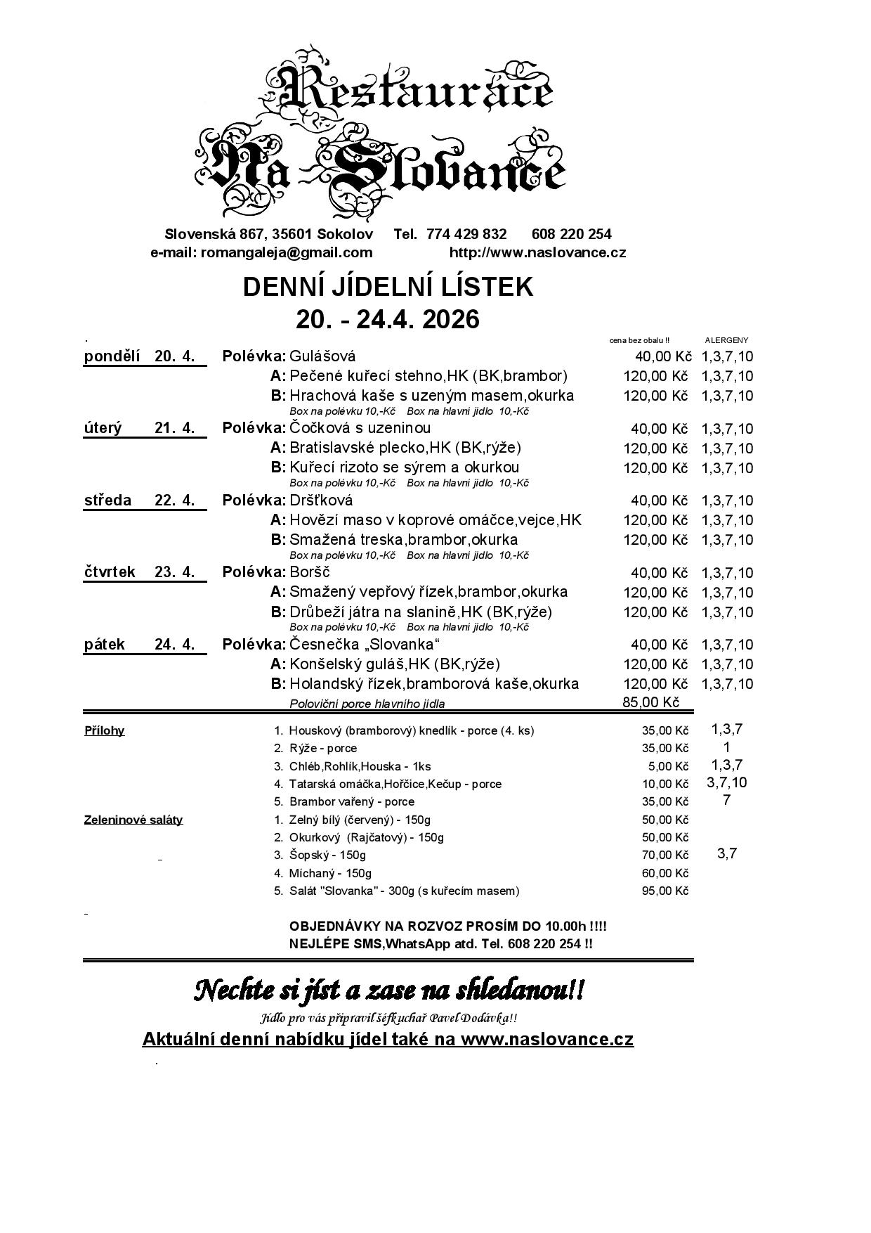 Restaurace na slovance Zvětšit jídelní lístek RESTAURACE NA SLOVANCE kONTAKT Telefon 608 220 254, 774 429 832 E-mail romangaleja@gmail.com Adresa Slovenská 867, Sokolov, 35601 Mapa Jméno E-mail Zpráva 15 + 5 = Odeslat Vytvořilo webové a grafické studio Blatná